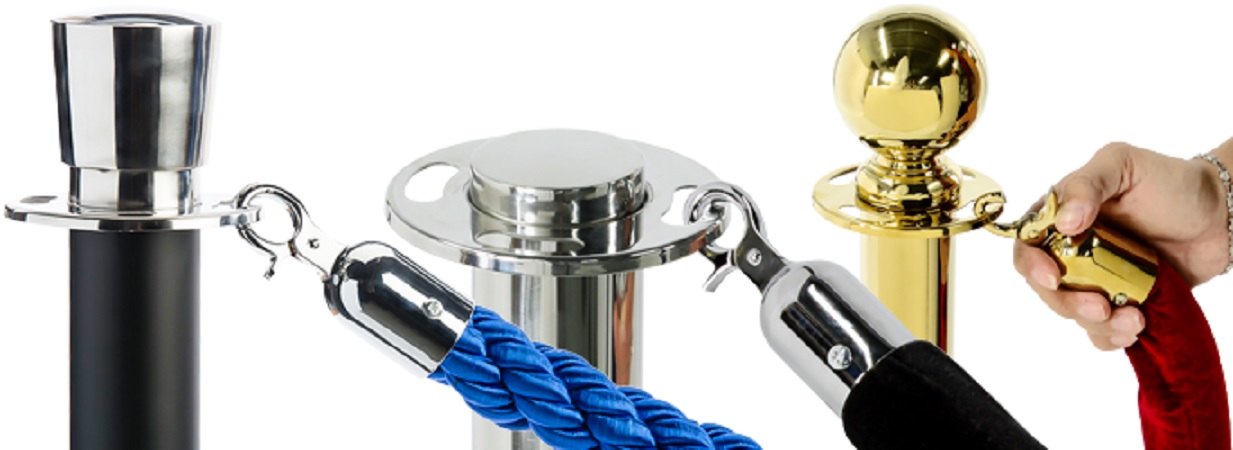 Classic and contemporary rope, including brass and red velvet styles, are sold in sets as well as single posts, ropes, and accessories