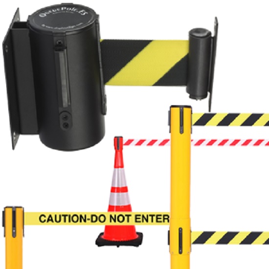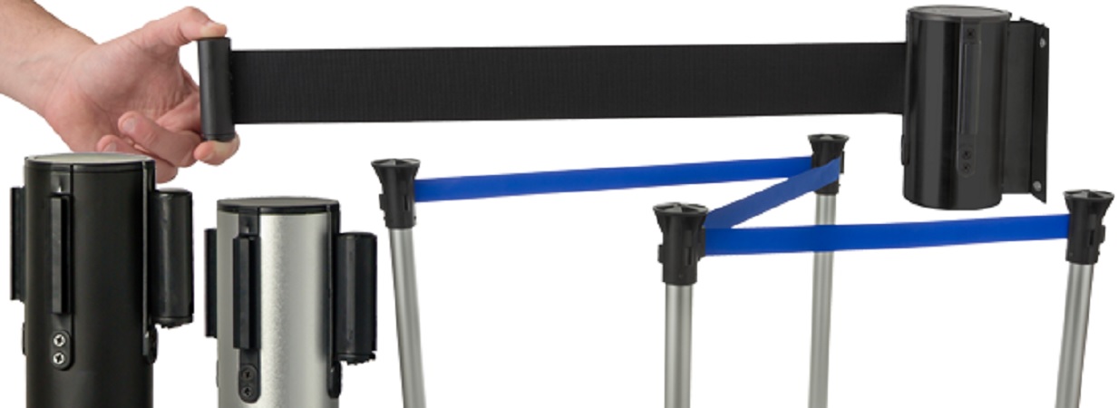 - Retractable belt barriers use plain or custom-color nylon belts to delineate space in commercial environments. In addition to freestanding posts, wall mount adapters are available that allow more permanent installation.